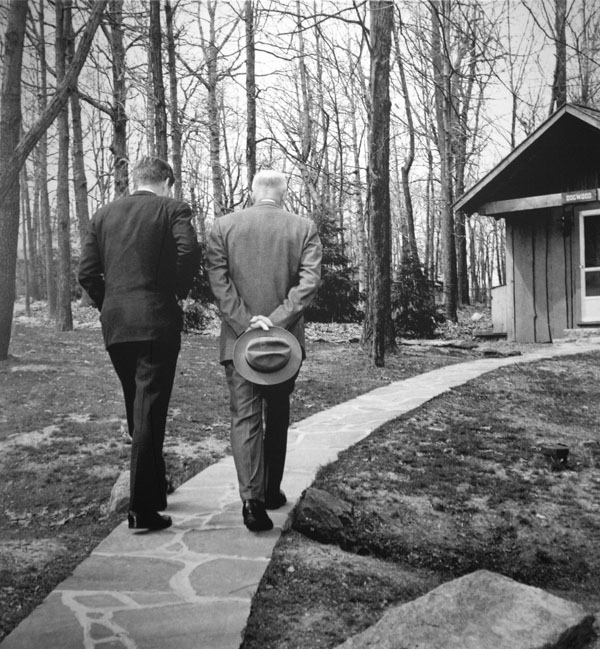 President John F. Kennedy and former president Dwight D. Eisenhower are having a wintertime walk at Camp David in winter. Kennedy has just asked Eisenhower what he thinks of the botched Bay of Pigs Invasion. Vathis claims that immediately before the question, both men had been holding their heads high.